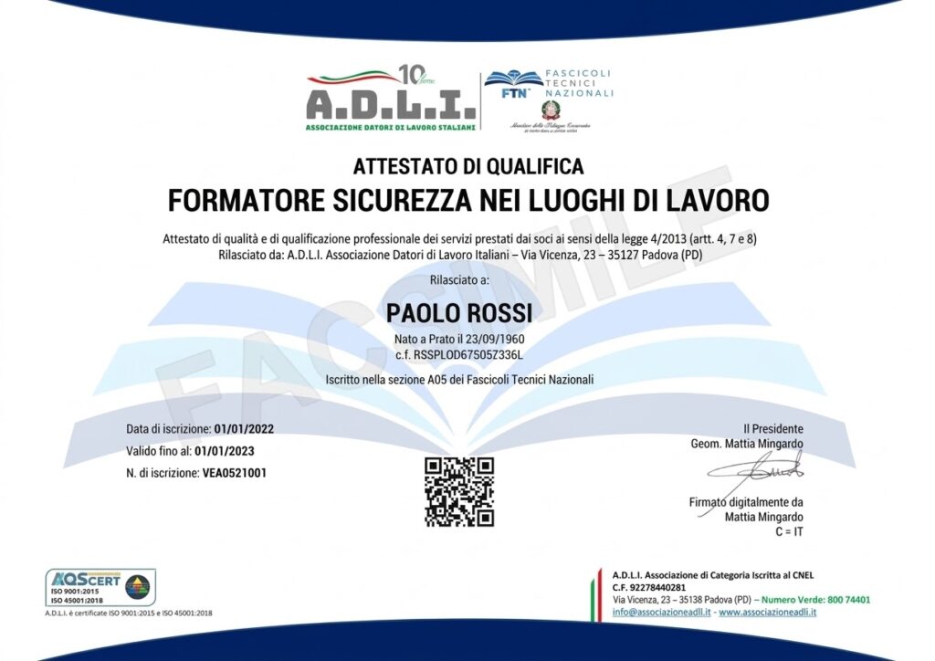 Superato l’iter di iscrizione ai Fascicoli Tecnici Nazionali il candidato otterrà un attestato di qualifica prfoessionale riconsciuto dal MiSE che certificherà che il professionista che lo ha ottenuto risponde ai requisiti di qualità delineati da A.D.L.I. e dai suoi organi competenti.